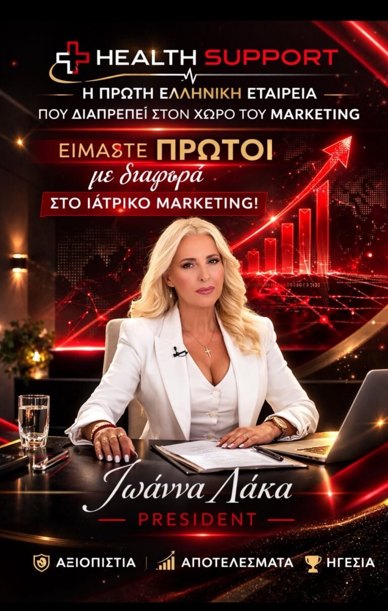 Η Ιωάννα Λάκα είναι η ιδρύτρια και Πρόεδρος της Εταιρείας Υγείας Support & Advisor, ενός ηγετικού οργανισμού στον χώρο του ιατρικού marketing και της σύγχρονης επικοινωνίας υγείας. Διαθέτει πολυετή εμπειρία στον στρατηγικό σχεδιασμό και την προώθηση ιατρικών υπηρεσιών, ηγούμενη με όραμα, συνέπεια και ξεκάθαρη στρατηγική κατεύθυνση.